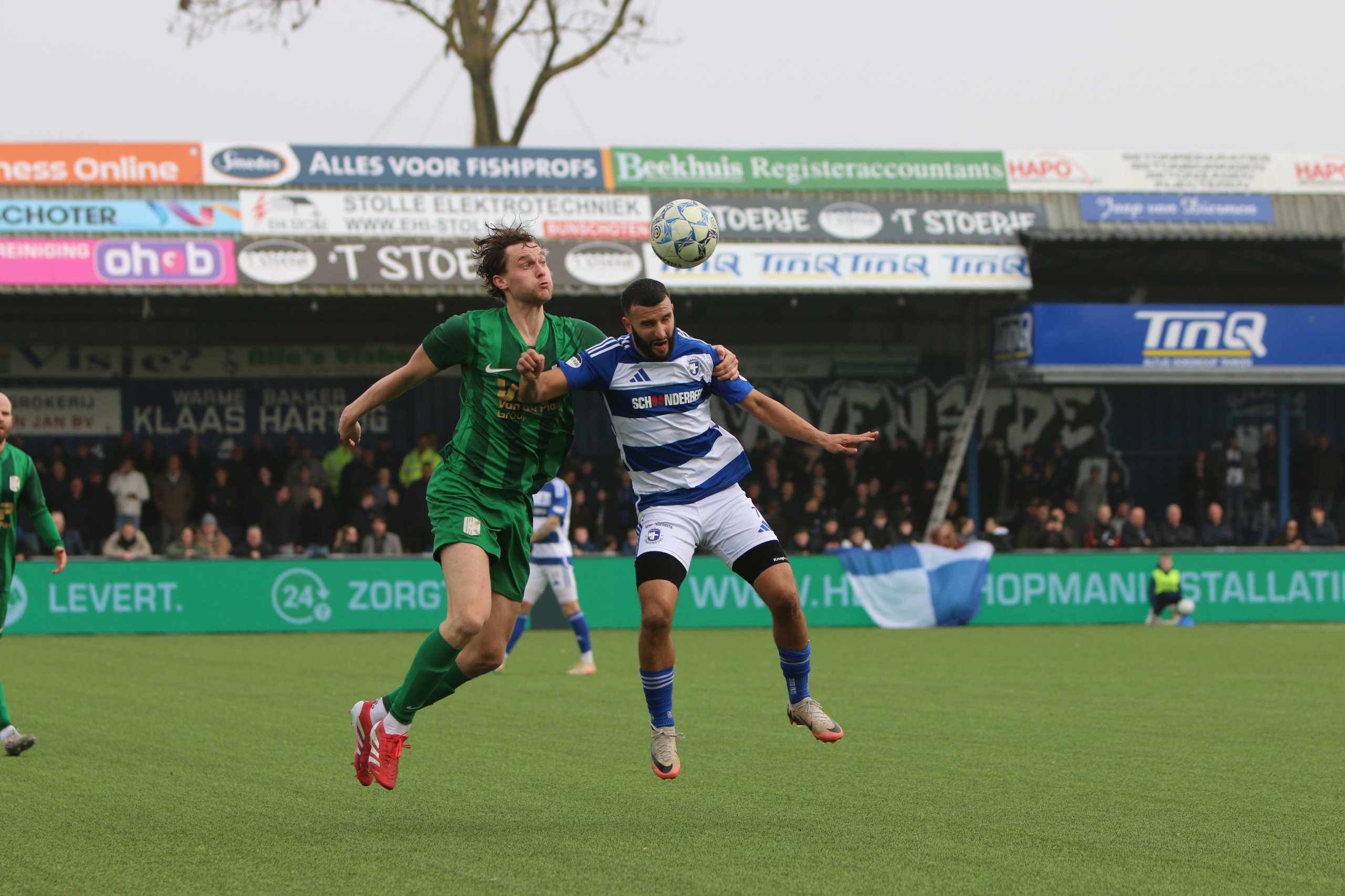 Op een bewolkte wintermiddag met lenteachtige temperaturen is het gezellig druk op De Westmaat. Geen bomvolle tribunes, maar wel een goede sfeer voor een duel tussen twee ploegen uit de bovenste regionen van de Tweede Divisie.